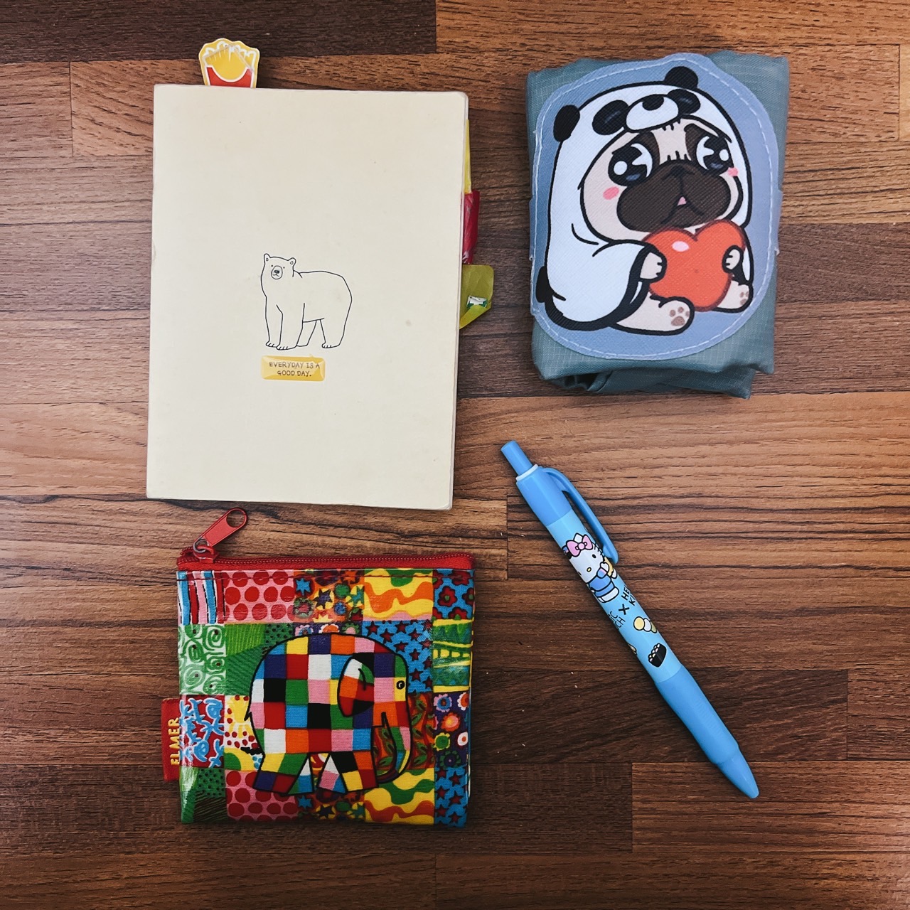 除了上述物品其實我還有會帶的東西,就是第7張照片中的環保袋、筆、小本子和裝手帕的小扁包,我不是會特別買環保袋的人,平常有很多管道可以拿到? 像這個就是之前買護髮品送的,筆也是吃壽司抽到的禮物,驚訝的是意外的很好寫!偶爾想到事情要寫在本本上的時候就拿來用,或是像現在防疫期間如果要寄東西或簽字也可以用,最後的手帕扁包是朋友出國紀念品,裡面是輕薄且速乾的手帕,主要拿來擦手。