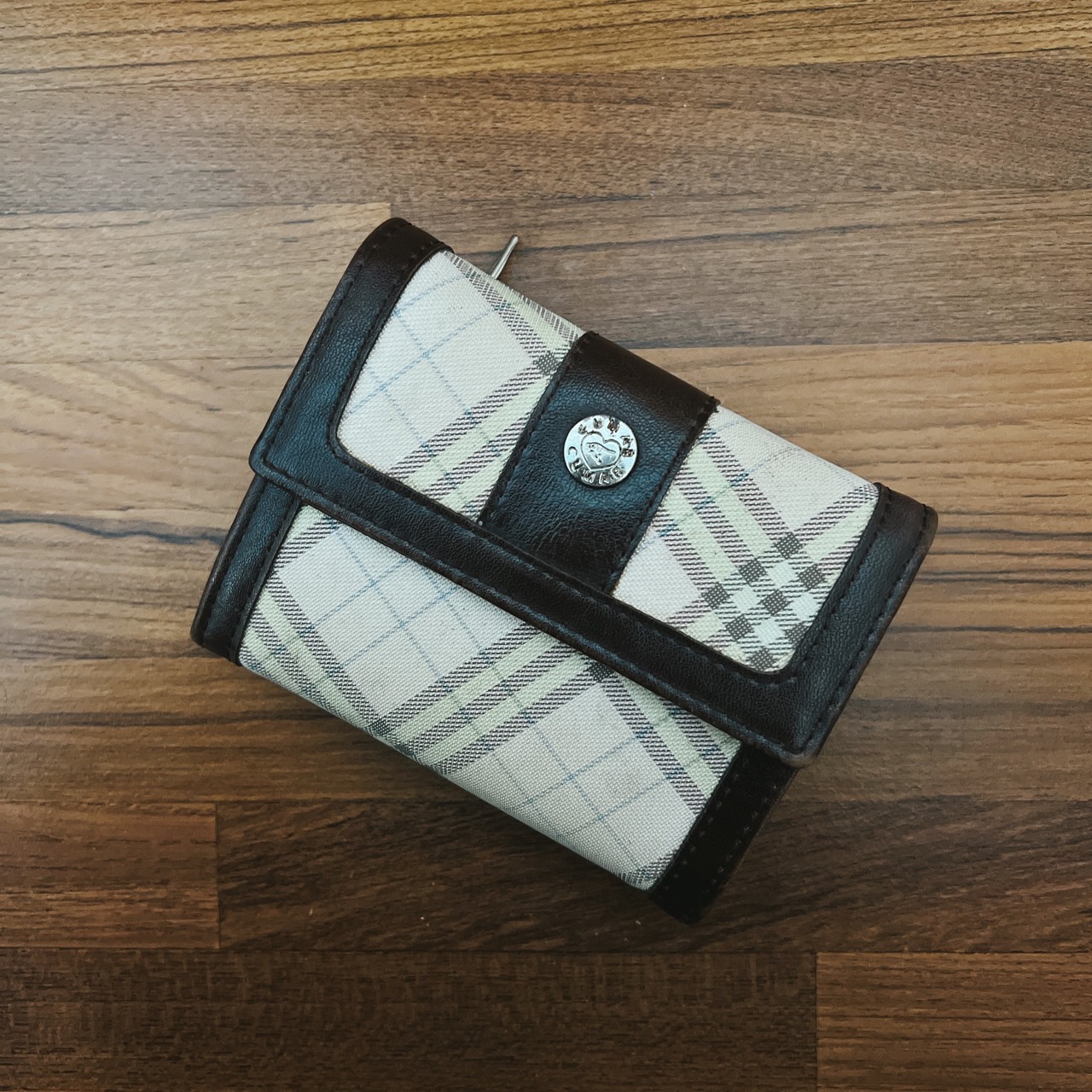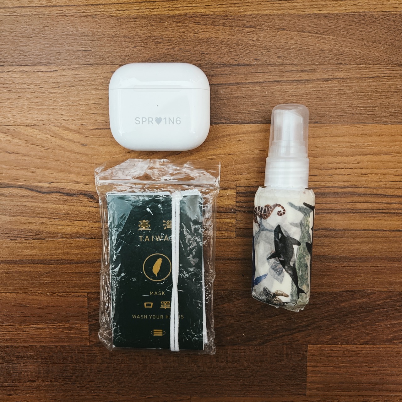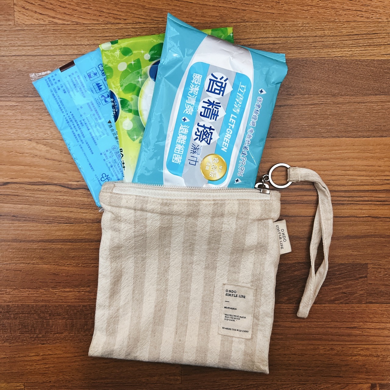 第二個是條紋小包,因為很輕薄也四四方方的就拿來裝濕紙巾、酒精擦和衛生紙這類的東西。第三個是皮夾,其實原本去年打算買新的,而且因為30歲就想買好一點的,但實在沒找到一見鍾情的就把那個預算拿去用在其他有意義的事情上,不過整理房間時找到媽媽送的第一個皮夾,雖然有點老舊掉漆但還是很好看就拿出來用了。除了這些,我會把耳機放在束口袋側邊的小分隔裡,酒精和口罩收納夾則可以很好的卡在中間??