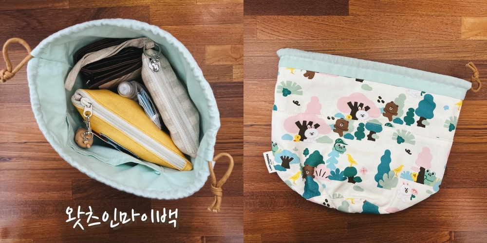 我是很喜歡束口袋或是小收納包的人,首張照片的LINE圖案束口袋裡面裝了3個大東西和幾個小東西,都是我出門的必備品。所以每次換包包我只要把這個束口袋拿起來移動就一切OK了,久而久之挑包包也會照它的形狀大小去挑XD