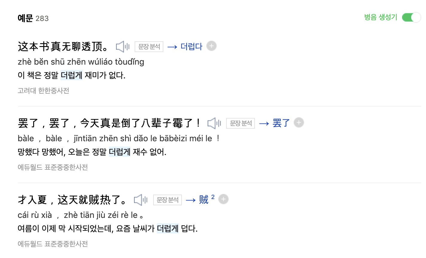但其實在這裡是下圖顯示的意思(特別搜尋中文例句大家應該會比較了解,如果本身會韓文的人想搜尋可以用NAVER國語字典)