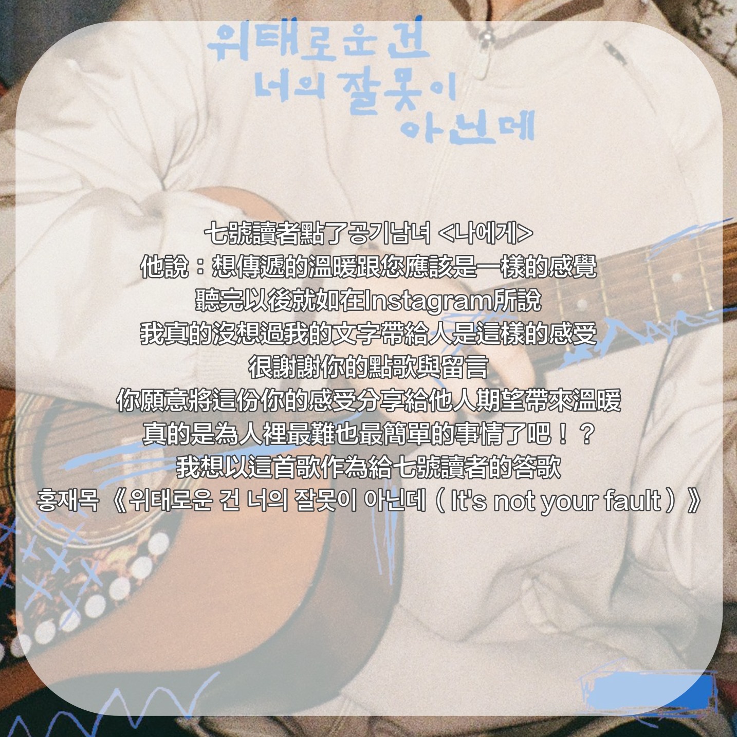「雖然沒有認真看了這部劇,但是感受到他想傳遞的溫暖跟您應該是一樣的感覺,偶然聽到這首歌真的給我很大的鼓勵,歌詞寫的很真切很觸動我心,好像真的可以療癒到內心,所以才推薦的!現在是我拿來安慰人的主題曲XD希望您也會喜歡❤️」