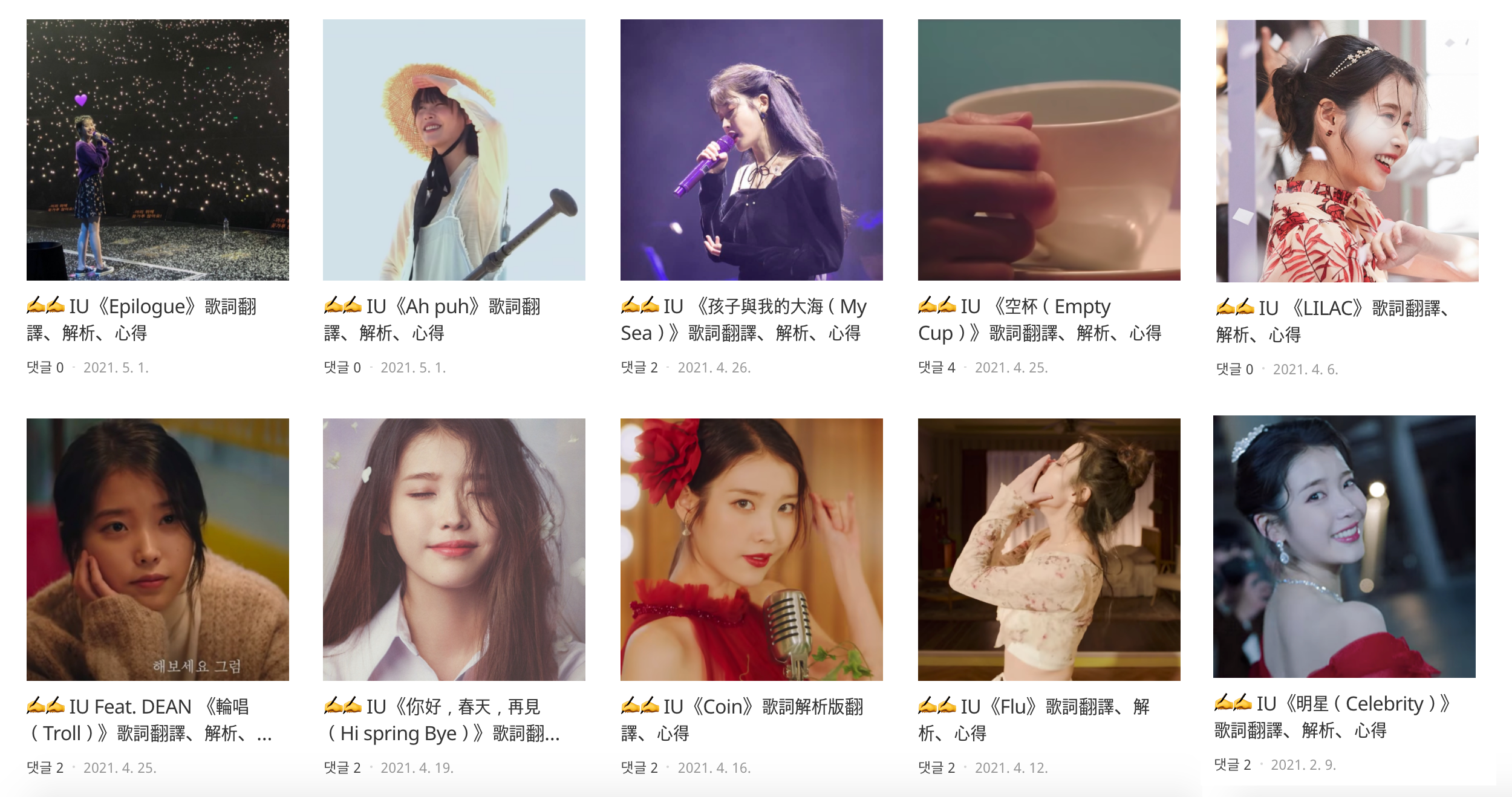 | ✍✍ IU Feat. DEAN 《輪唱(Troll)》歌詞翻譯、解析、心得 (0) | 2021.04.25 |